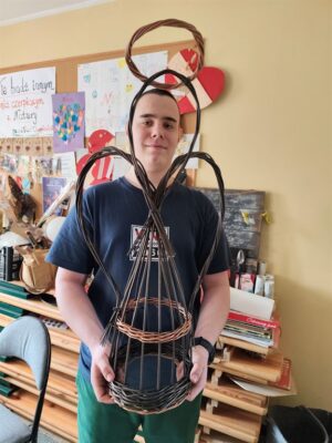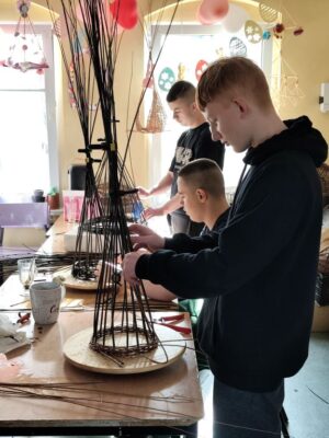 W naszej pracowni powstają wiklinowe anioły, które będą ozdobą wnętrz oraz ogrodu. Wyplatanie to trudna umiejętność, która wymaga dużego wysiłku fizycznego i skupienia umysłu. Lecz to co napędza naszych wychowanków do pokonania tych trudności to motywacja. Motywacja pozwala osiągnąć sukces, znaleźć sens, zaciekawienie, czego efektem jest rozwój osobisty człowieka.
