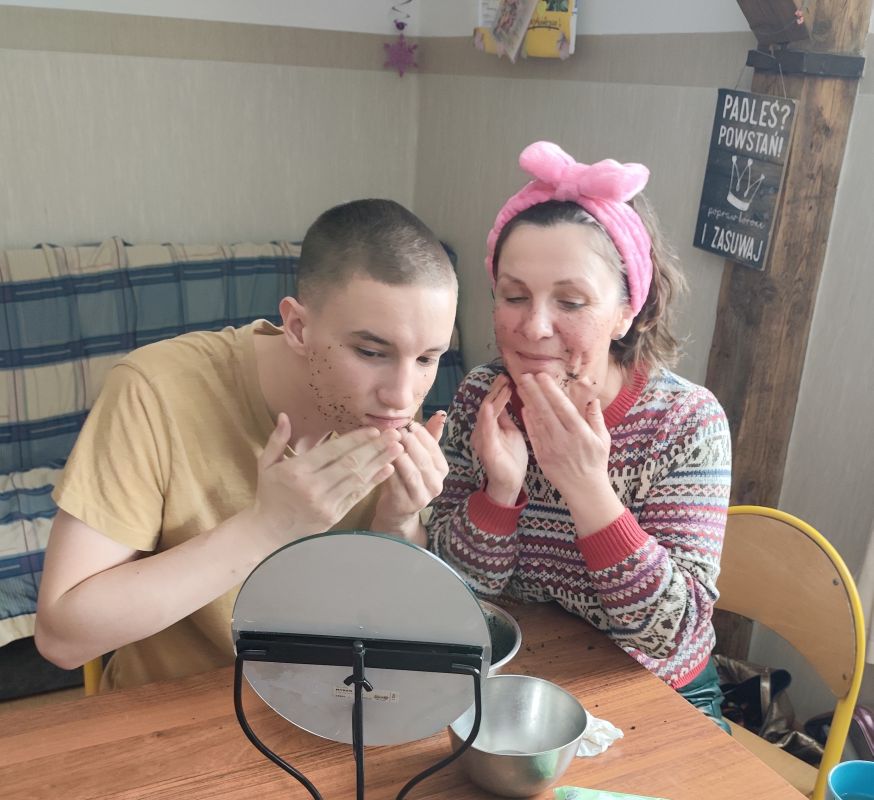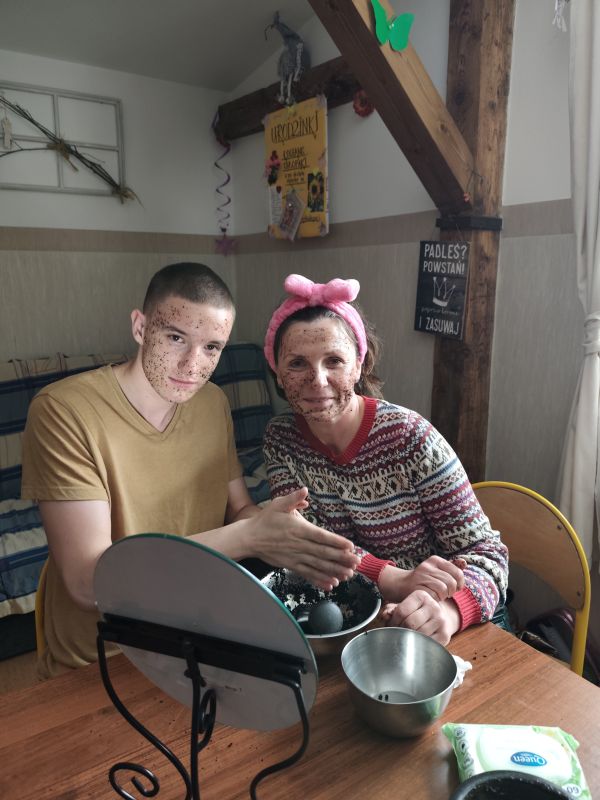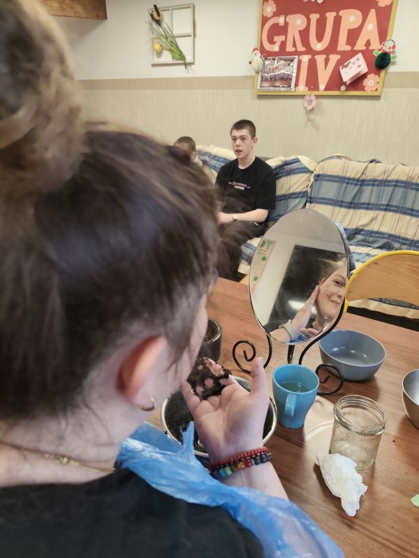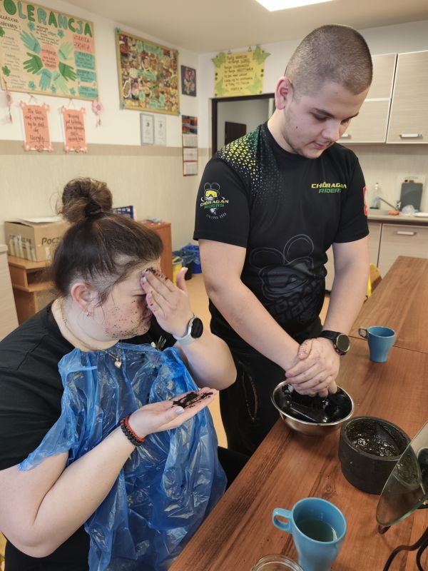 W ramach feryjnych zajęć z Hortiterapii na grupie 4 wychowankowie nauczyli się jak z wykorzystaniem łatwo dostępnych produktów spożywczych można przygotować kosmetyki do ciała. Używając goździków, sody, mięty i oliwy przygotowali wybielającą pastę do zębów. Natomiast przy użyciu kawy, miodu oraz oliwy powstał scrub do twarzy i rąk, który w naturalny sposób wygładzi i odżywił wysuszoną skórę. Z octu jabłkowego i wody stworzony został oczyszczający tonik do twarzy. Do  wypróbowania przygotowanych kosmetyków dołączyli również dyżurujący wychowawcy.
