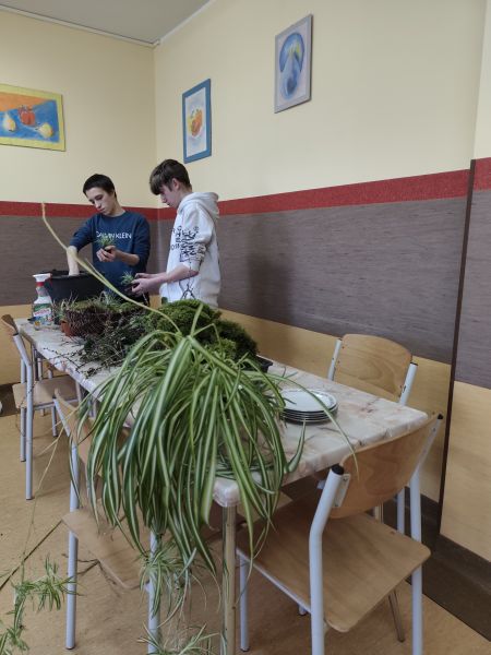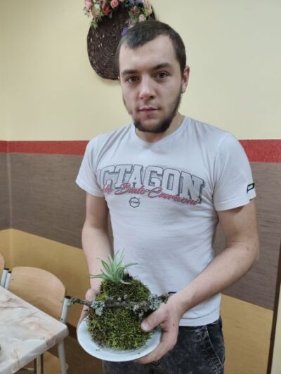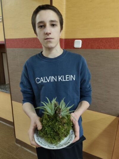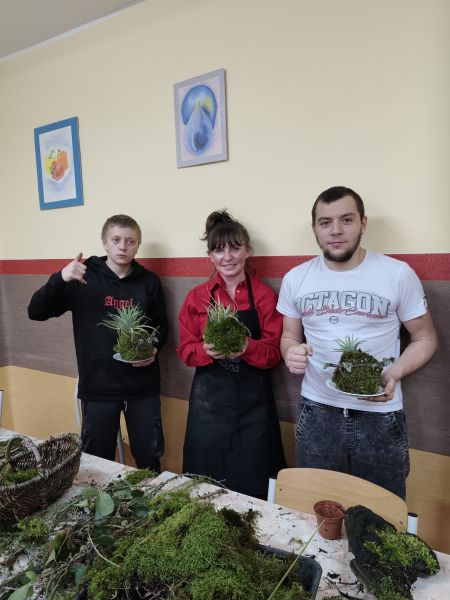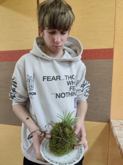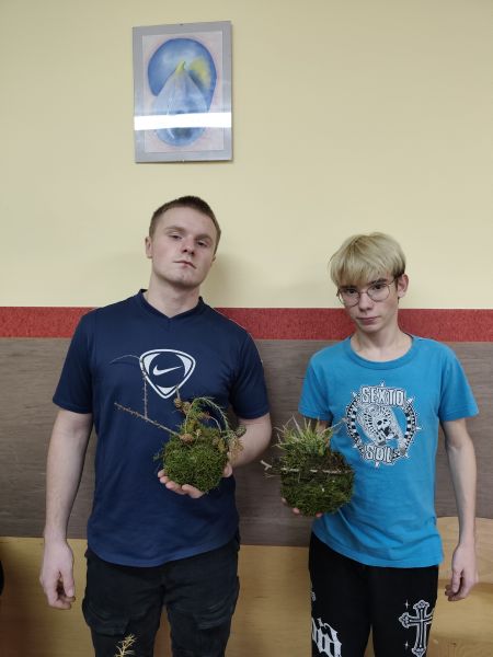 Kokedama to japońska sztuka tworzenia ozdobnych roślinnych „kul mchu”, które uprawia się bez doniczek. Roślina jest umieszczana w uformowanej kuli z mieszanki ziemi, mchu i gliny, którą następnie owija się mchem i zabezpiecza sznurkiem lub drutem. Gotową kokedamę można postawić na podstawce lub powiesić w oknie. Na zajęciach z hortiterapii nasi wychowankowie bez trudu podjęli się wykonania zadania kuli z mchu, które będą stanowić ozdoby w ich sypialniach.
