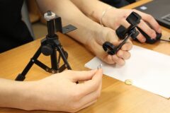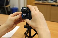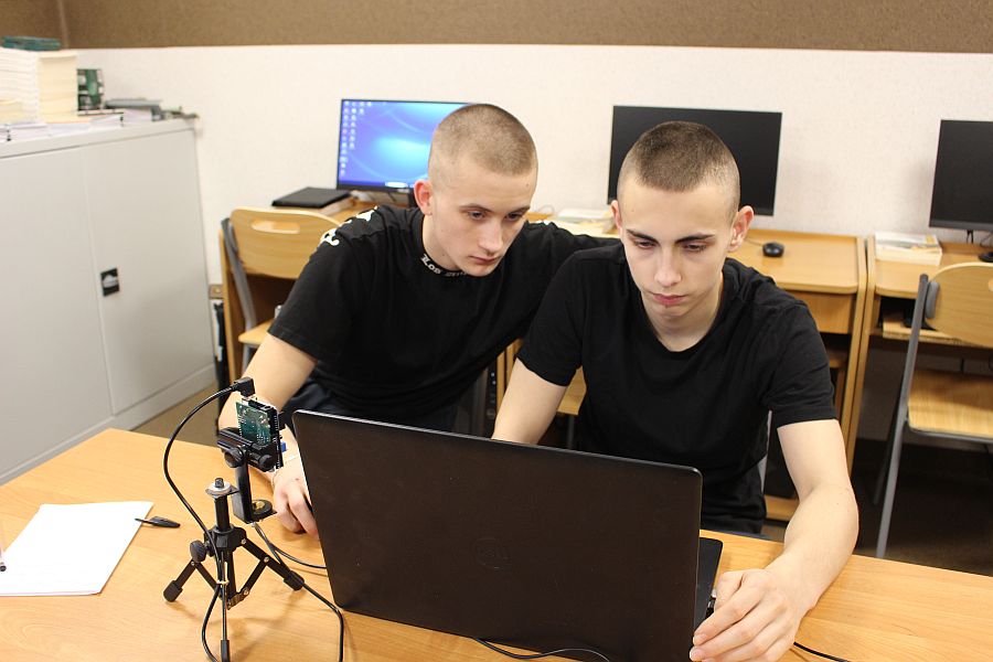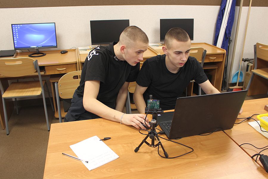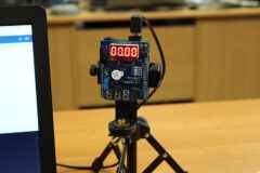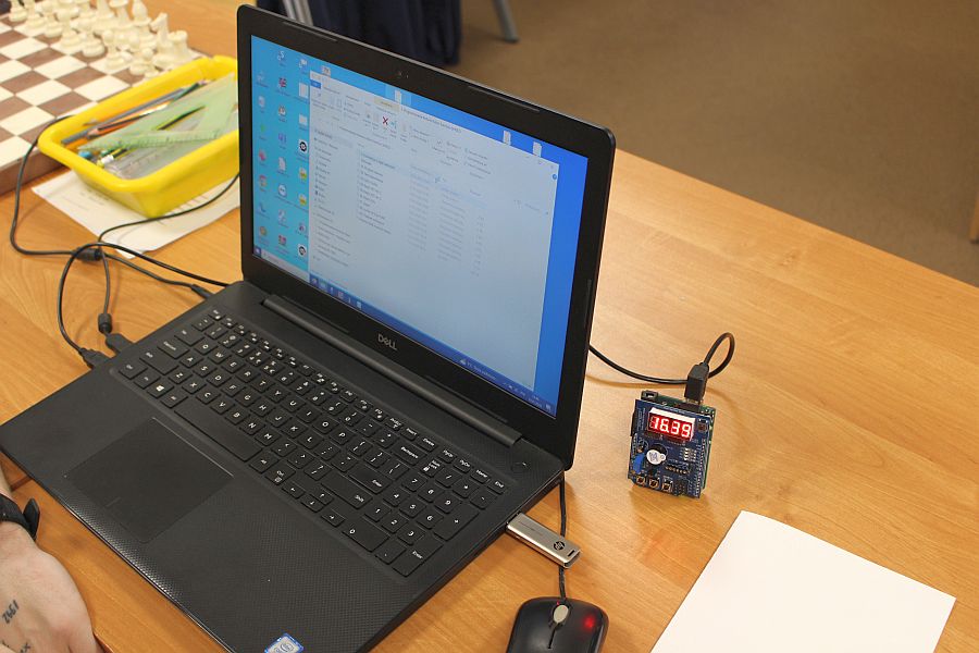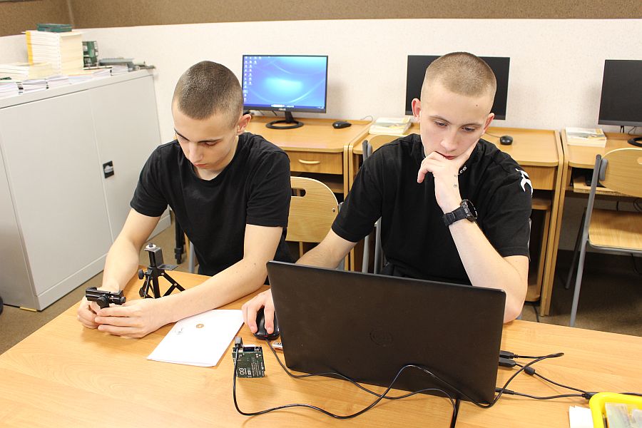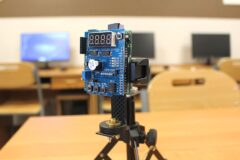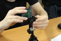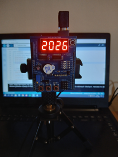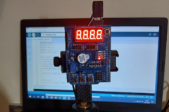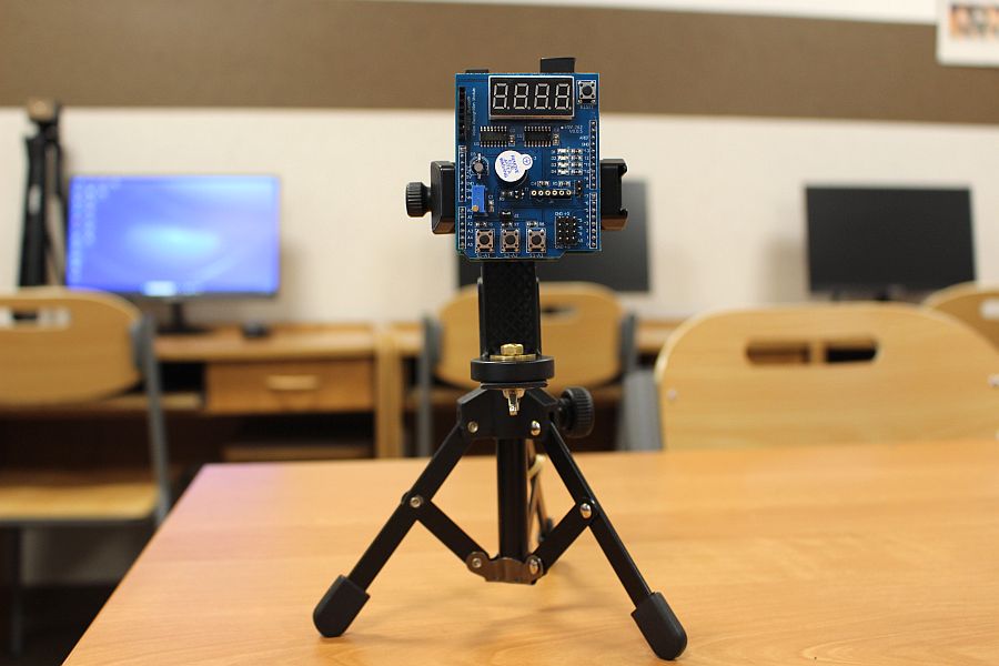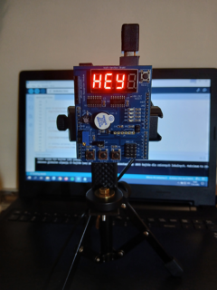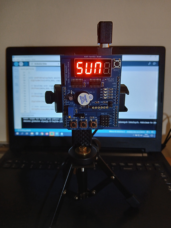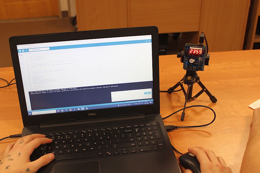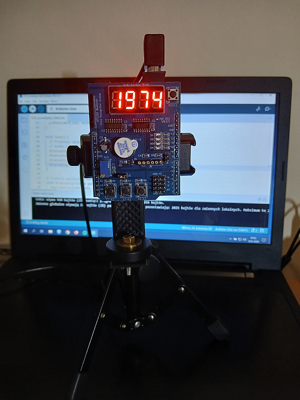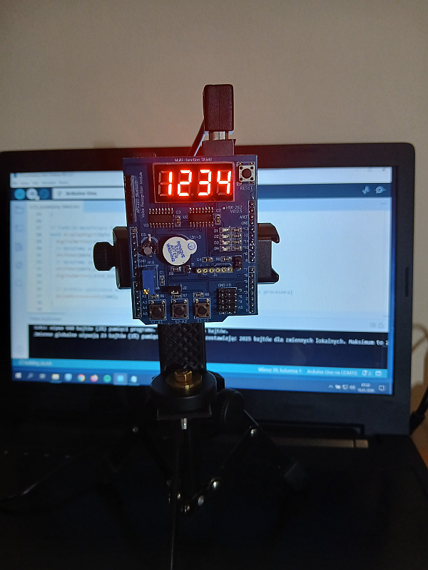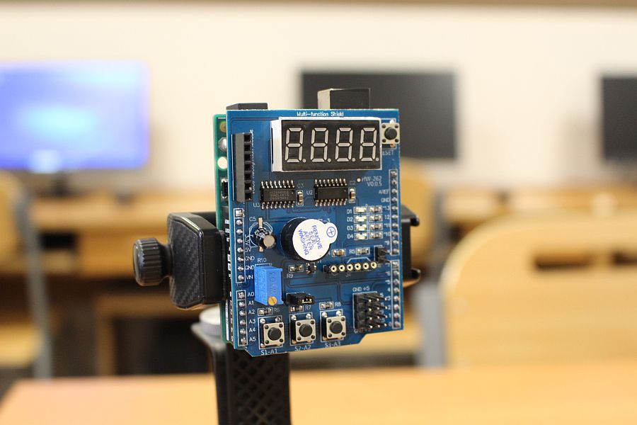 Podzespół elektroniczny Multifunction Shield zamienia płytkę Arduino w mini-laboratorium do nauki programowania elektroniki i mechatroniki. Posiada zintegrowany 4-cyfrowy wyświetlacz 7-segmentowy, który jest obsługiwany przez dwa rejestry 74HC595, przez co zużywa zaledwie kilka pinów mikrokontrolera. Dzięki bezpośrednim połączeniom gniazdowym nie wymaga połączeń przewodowych, więc całość układu zamocowana na naszej autorskiej konstrukcji, nieźle się prezentuje i jest wygodna do nauki. Gdy podzespół był już zamocowany na statywie, chłopcy mogli zacząć prace nad jego programowaniem. Najpierw napisali i uruchomili krótki program testowy, kontrolujący poprawność działania pinów i segmentów wyświetlacza.