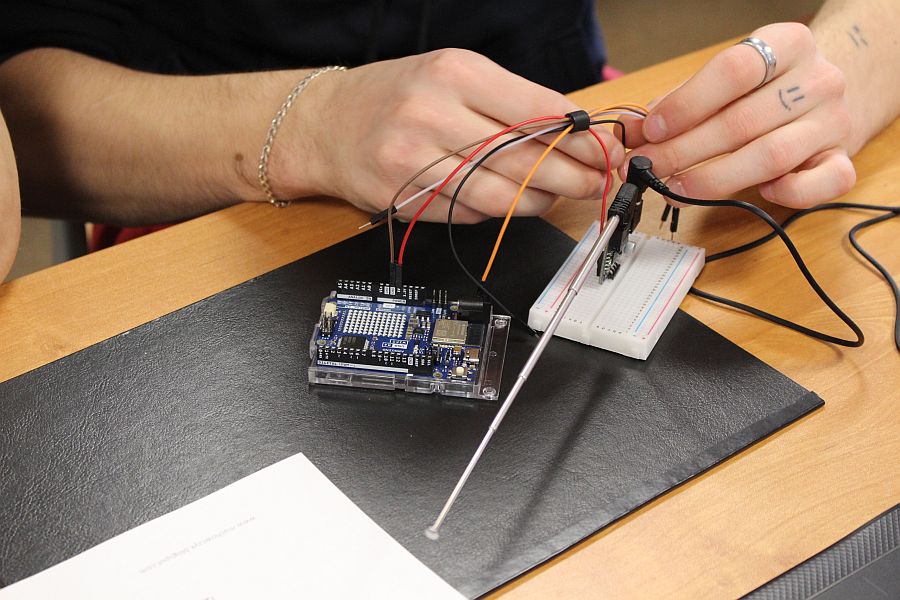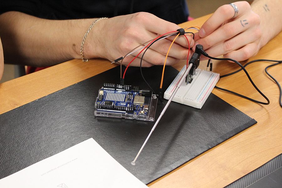 Na przełomie lutego i marca 2026 r. na zajęciach koła robotyki i mechatroniki nasi uczniowie rozpoczęli kolejny projekt z dziedziny budowy oraz programowania układów elektronicznych. Tym razem skonstruowali obwód oparty na płytce Arduino Uno R4 oraz na module EA5767, który umożliwia odbiór fal radiowych FM. Jest to moduł wyposażony w antenę teleskopową oraz złącze Mini Jack 3,5 mm, do podłączenia głośników lub słuchawek. Jednak budowa samego układu na płycie stykowej to dopiero początek. Aby układ zadziałał, należy napisać program w języku C++ i przesłać go z komputera do mikroprocesora układu, określając w kodzie częstotliwość fal dla każdej z odbieranych stacji radiowych.