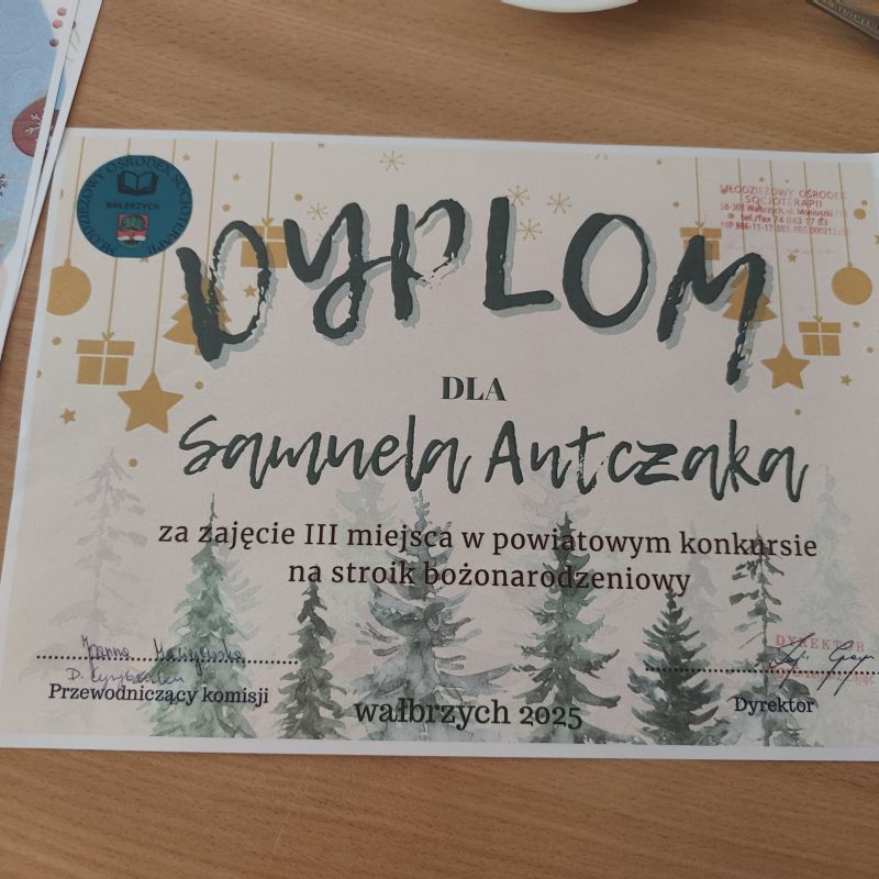 Miło nam poinformować, że nasz wychowanek klasy drugiej – Samuel zdobył trzecie miejsce w konkursie świątecznym o randze powiatowej, na najładniejszy stroik świąteczny. Konkurs zorganizowany został przez Miejski Ośrodek Socjoterapii w Wałbrzychu. Do konkursu przystąpiło jeszcze dwóch naszych wychowanków, którzy za udział i przygotowane stroiki otrzymali podziękowania i wyróżnienia.