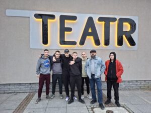 W niedzielę 5 października 2025r. z grupą wychowanków naszej placówki udaliśmy się do Teatru Dramatycznego w Wałbrzychu na sztukę “czy pingwiny mają kolana”. Pandemia, inflacja, wojna, klimatyczne ocieplenie, internet, korporacja, kredyt, władza – to widok za oknem, którego zamknąć, ani zabić deskami się nie da, choć każdy chyba miałby na to ochotę. Równowagi szukamy na terapii, szukamy też pigułki szczęścia i szuka jej bohater tego spektaklu. Spektakl ten nie daje nam recepty na bolączki przegrzanego świata, nie daje nam pigułki szczęścia, ale może zaprosić nas do teatralnego gabinetu, w którym jest przejście do małych pytań o naszą kondycję. Aneta Groszyńska dokonuje efektywnej próby zbudowania swojej rekonstrukcji w oparciu o palący społecznie problem – tym razem na podstawie tekstu reportera i dziennikarza Marcina Kąckiego. Interesująca, prezentująca dobrą zabawę opartą na ostrej satyrze na frustracje człowieka pracy XXI prezentuje ważna treść. Taka formuła przedstawienia spowodowały, że sztuka „Czy pingwiny…” została pozytywnie oceniona przez naszych uczniów. Ważnym elementem tego wyjścia do teatru było również spotkanie z Pedagogiem Teatralnym Panią Renatą Ambrożak. Rozpoczęło to nowy cykl spotkań teatralnych które pozwolą naszym uczniom na jeszcze głębsze zrozumienie oglądanych przez nasz sztuk teatralnych a jednocześnie otworzą dyskusję na wiele palących nas tematów.