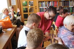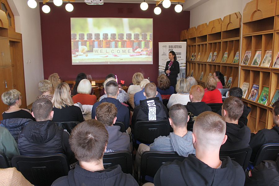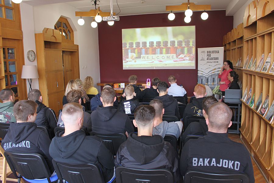21 kwietnia bieżącego roku szkolnego, wychowankowie naszej placówki udali się do Biblioteki pod Atlantami na spotkania z bardzo ciekawymi osobami. Najpierw odwiedziliśmy introligatornię, gdzie pani Ania Szymańska, introligator biblioteki, opowiedziała nam jak wygląda praca introligatora i jaką drogę musi przejść zniszczona książka aby ponownie trafić do rąk czytelnika. Każdy przez moment poczuł się w roli „lekarza książek”. Następnie przeszliśmy do Czytelni Czasopism, gdzie odbyło się spotkanie z Kingą Mleczko – studentką naturoterapii, praktykiem aromaterapii, a także teologiem, historykiem i dziennikarzem. To właśnie ona wprowadziła nas w świat przyjemnych zapachów w postaci olejków eterycznych, ich wpływie na zdrowie i samopoczucie. Aromaterapia od dawna przyciąga osoby, które szukają bardziej naturalnych sposobów dbania o siebie. Degustacja  wraz z uzyskaną wiedzą  dała nam wiele do myślenia, większość z nas zastanawiała się czy naprawdę naturalne olejki mają aż taką moc. To były naprawdę pouczające spotkania, chociaż każde zupełnie inne.