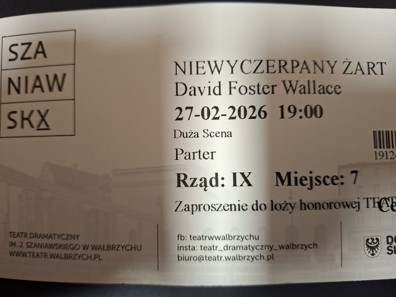 W piątek 27 lutego 2026 r. z grupą wychowanków naszej placówki udaliśmy się do Teatru Dramatycznego w Wałbrzychu na sztukę “Niewyczerpany żart”. Ta sztuka to adaptacja ponad 1000 stron i 1,5 kilograma literackiego i teatralnego przeciążenia, kwestionującego szaleństwo teraźniejszości balansującej pomiędzy wzrostem a upadkiem – tak w skrócie można opisać “Niewyczerpany żart” Davida Fostera Wallace’a. Powieść porusza między innymi tematy narkomanii, hedonizmu, depresji, molestowania dzieci, materializmu, przemysłu rozrywkowego oraz tenisa. Jest tekstem społecznym, który przedstawia komiczny i przerażający portret cywilizacji odurzonej współczesnością, marzeniami o sukcesie i ciągle znerwicowanej możliwą porażką.