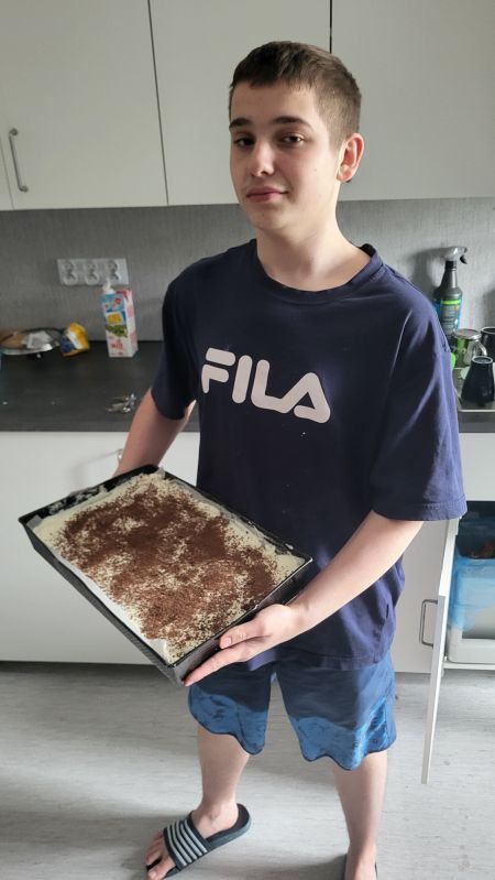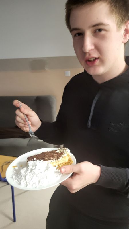 Wielką popularnością wśród naszych wychowanków cieszą się zajęcia kulinarne. W dniu 4 kwietnia postanowiliśmy przygotować ciasto 3-bit. Wspólnie, kilka dni temu,  dokonaliśmy właśnie takiego wyboru. Wychowawca postarał się o potrzebne produkty i niezbędne akcesoria kuchenne. Dziś szefami kuchni zostali Łukasz i Mateusz, którym w trudnej sztuce kulinarnej chętnie pomagali inni wychowankowie. O porządek w aneksie kuchennym na bieżąco dbali szefowie kuchni.  Przygotowanie ciasta odbyło w najlepszym porządku : czysto, smakowicie , zgodnie ze sztuką kulinarną.  A jak już podano do stołu to „palce lizać”. Wszystkim bardzo  smakowało  ( osobiście zaświadczam) i pięknie wyglądało, bo wygląd też ma znaczenie.
