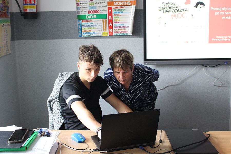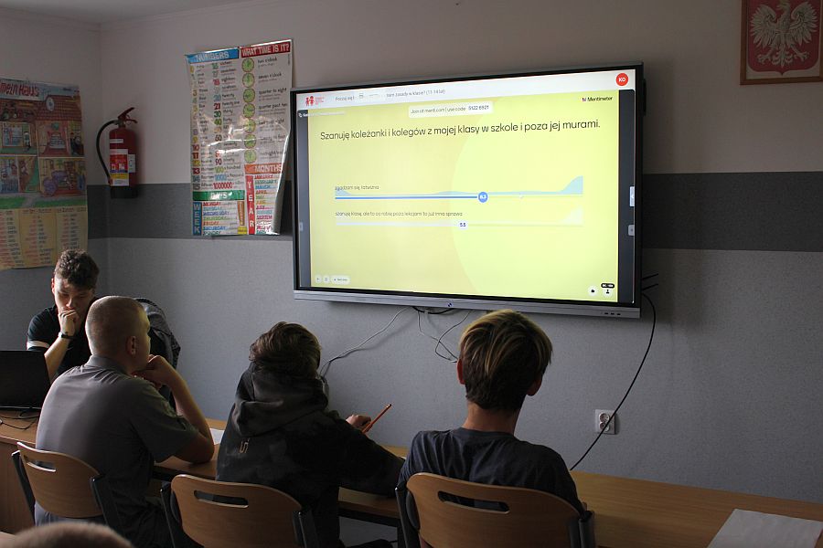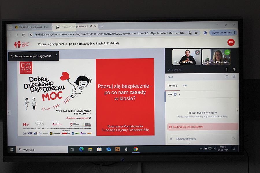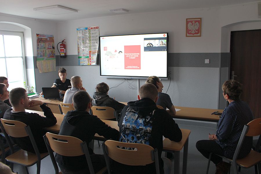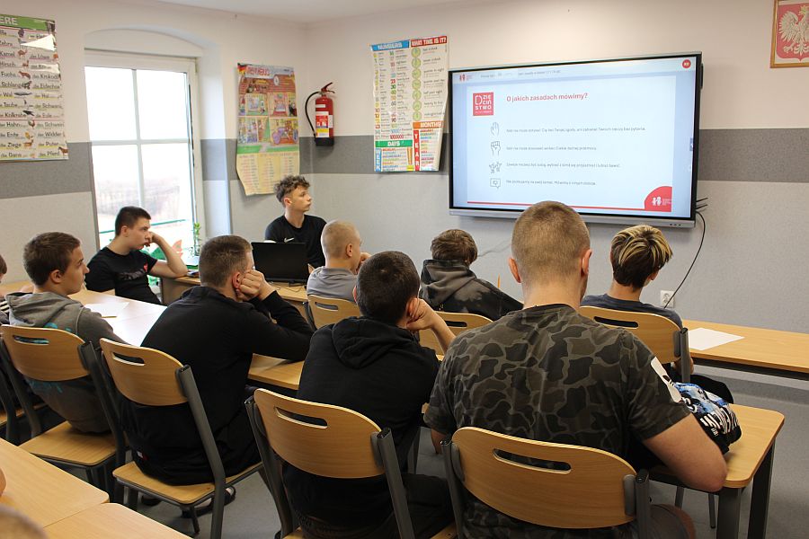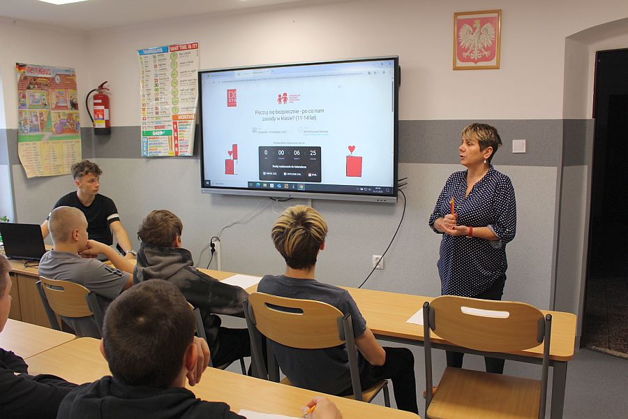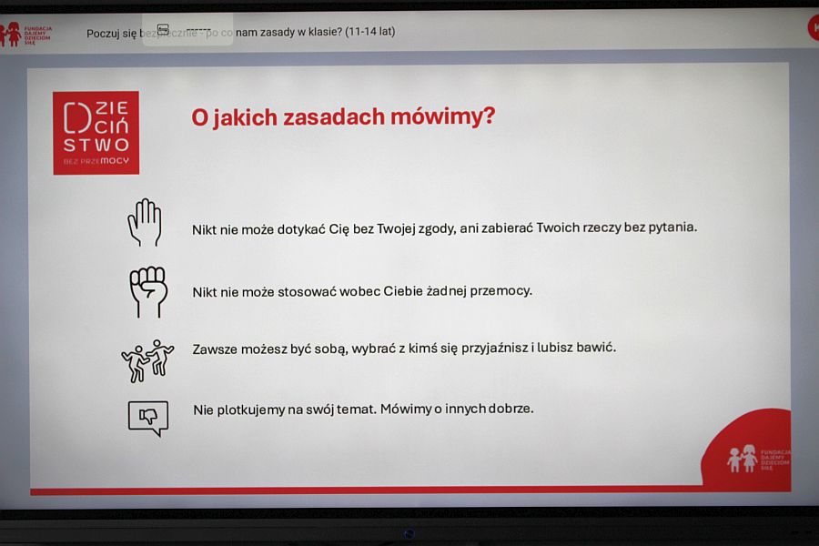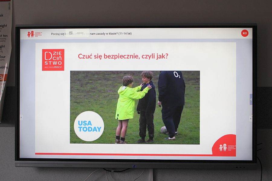 Kampania Dzieciństwo bez Przemocy jest coroczną, ogólnopolską akcją, mobilizującą całe społeczeństwo do zapobiegania krzywdzeniu dzieci oraz podejmowania działań na rzecz budowania bezpiecznego dzieciństwa, dlatego nasza placówka zgłosiła w niej swój udział. Oprócz zajęć, które odbywały się podczas lekcji i zajęć bibliotecznych, postanowiliśmy wziąć udział w zajęciach prowadzonych w formie interaktywnej  pt. „ Poczuj się bezpiecznie – po co nam zasady w klasie”–  gdzie młodzież obejrzała krótkie materiały filmowe, wzięła udział w głosowaniach online. Punktualnie o 8.55 połączyliśmy się na żywo z panią Katarzyną Poniatowską – socjoterapeutką,  pedagożką resocjalizacyjną, specjalistką ds. ochrony dzieci Fundacji Dajemy Dzieciom Siłę, która prowadziła zajęcia dla ponad 2000 klas. W naszej szkole uczestniczyły klasy I oraz klasa 8, a Podczas lekcji uczestnicy zastanowią się, jakie znaczenie mają bezpieczne relacje i dlaczego umiejętność mówienia „stop” albo „nie” bywa trudna, a jednocześnie bardzo potrzebna. Na samym końcu uczniowie próbowali wybrać listę zasad, które mogą pomóc budować w klasie atmosferę szacunku i zaufania. Wszystkim bardzo podobała się ta inna forma zajęć, każdy z zainteresowaniem słuchał i uczestniczył aktywnie w zajęciach.