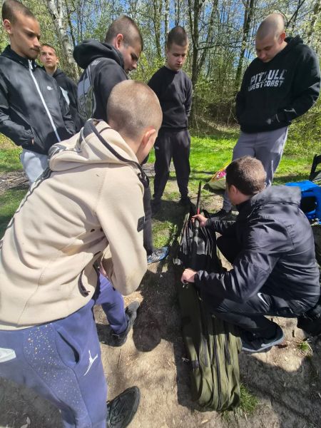 Dnia 25.04.2026 roku odbyły się kolejne zajęcia wędkarskie realizowane w grupie III na łowisku Poniatów. Zajęcia prowadzone przez wychowawcę pana Radka, stanowią ważny element procesu resocjalizacji wychowanków. Spotkanie miało charakter zarówno teoretyczny, jak i praktyczny, a jego głównym celem było nie tylko rozwijanie umiejętności wędkarskich, ale również kształtowanie postaw społecznych, odpowiedzialności oraz umiejętności współpracy w grupie. Podczas części teoretycznej wychowankowie zapoznali się z podstawami dwóch popularnych metod połowu – techniki feederowej oraz spławikowej. Omówiono różnice pomiędzy nimi, zastosowanie poszczególnych zestawów oraz warunki, w jakich sprawdzają się najlepiej. Szczególną uwagę zwrócono na budowę zestawu gruntowego – od doboru odpowiedniej wędki, poprzez kołowrotek, żyłkę, aż po koszyczek zanętowy i przypon. Wychowankowie mieli okazję samodzielnie analizować poszczególne elementy zestawu oraz uczyć się ich prawidłowego montażu. Istotnym elementem zajęć było również przygotowanie zanęty. Uczestnicy poznali składniki stosowane w wędkarstwie oraz ich znaczenie w przyciąganiu ryb. Pod okiem wychowawcy samodzielnie komponowali mieszanki, ucząc się proporcji, nawilżania oraz odpowiedniej konsystencji zanęty. Ta część zajęć rozwijała nie tylko umiejętności praktyczne, ale również cierpliwość, dokładność i umiejętność pracy według określonych zasad.